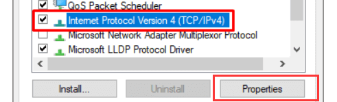 4. Highlight the Internet Protocol Version 4 (TCP/IPv4) and open its properties.